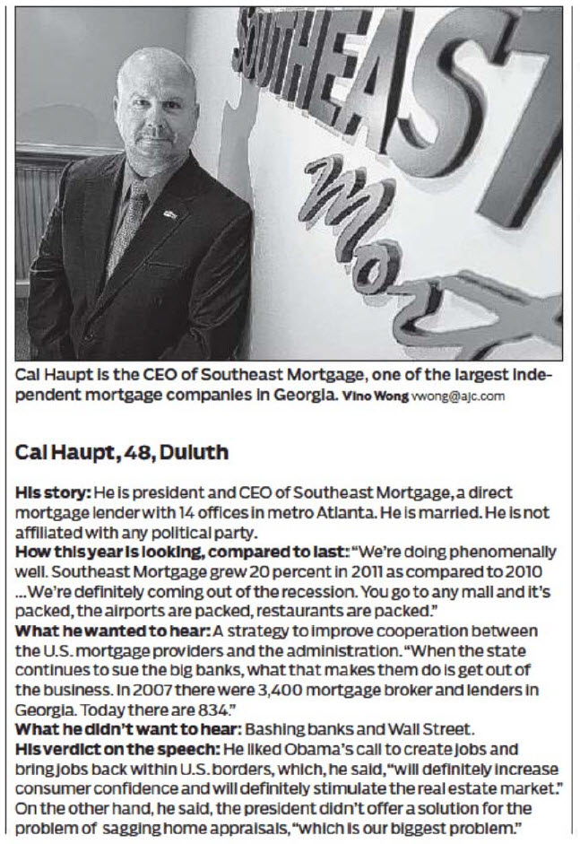 How this year is looking compared to last: "We're doing phenomenally well. Southeast Mortgage grew 20 percent in 2011 as compared to 2010….. We're definitely coming out of the recession. You go to any mall and it’s packed, the airports are packed, restaurants are packed.”What he wanted to hear: A strategy to improve cooperation between the U.S. mortgage providers and the administration. "When the state continues to sue the big banks, what that makes them do is get out of the business. In 2007 there were 3,400 mortgage broker and lenders in Georgia. Today there are 834."